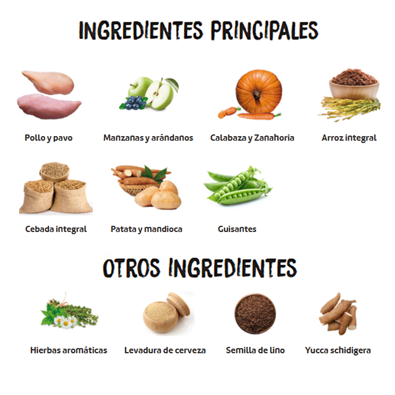 Pollo fresco* (15% mín. antes de la cocción), pavo fresco* (15% mín. antes de la cocción), pollo deshidratado (14%), grasa de pollo (preservada con antioxidantes naturales), guisantes enteros* (8%), patata deshidratada* (8%), arroz integral* (7%), raíces de mandioca* (4%), cerdo deshidratado (4%), cebada integral* (3%), salmón deshidratado (2,5%), levadura de cerveza* (2%), proteína hidrolizada de pollo (2%), huevo deshidratado* (2%), verduras y frutas frescas antes de la cocción (manzana* 1%, zanahoria* 0,5%, calabaza* 0,5%), semilla de lino* (1%), aceite de salmón (preservado con antioxidantes naturales), sal gema*, raíces de achicoria (FOS)*, extracto de levaduras (MOS), algas marinas deshidratadas* (500 mg/kg), glucosamina (500 mg/kg), yucca schidigera, condroitín sulfato (100 mg/kg), arándanos* (100 mg/kg), té verde* (80 mg/kg), equinácea* (80 mg/kg), flor de manzanilla* (80 mg/kg), hinojo* (80 mg/kg). *INGREDIENTES NATURALES