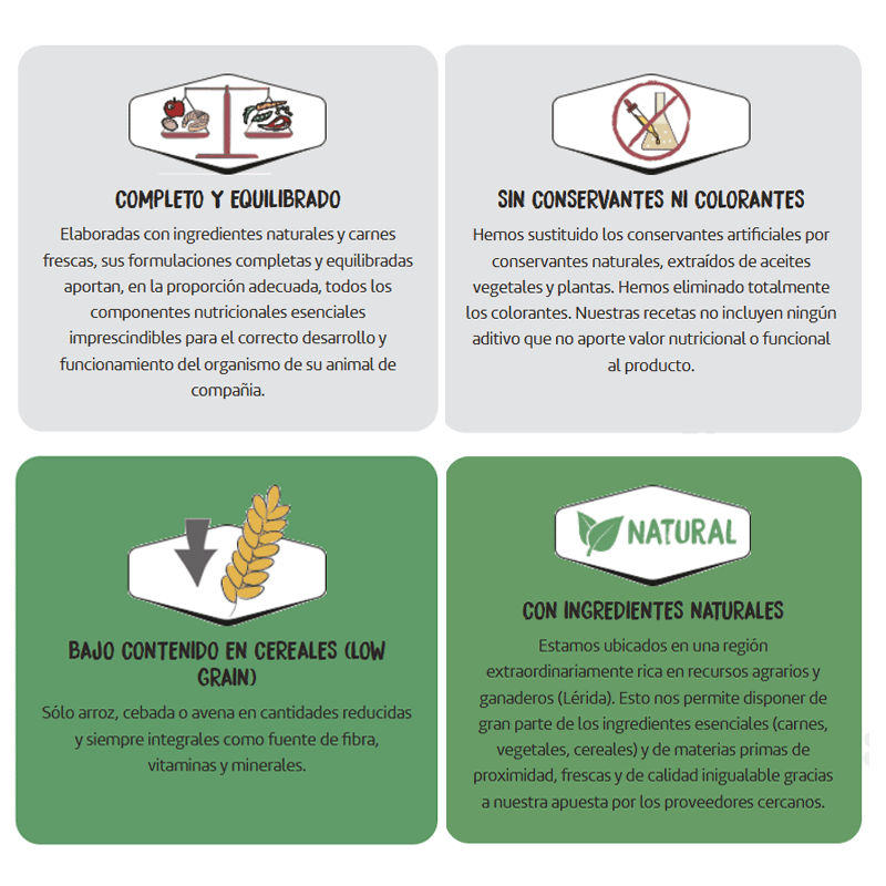 Vitamina A 22.000 UI, vitamina D3 1.800 UI, vitamina E 400 UI, vitamina C 100 mg, taurina 1.000 mg, L-carnitina 40 mg, cobre (sulfato de cobre (II) pentahidratado) 4 mg, cobre (quelato de cobre (II) de aminoácido hidratado) 5 mg, manganeso (óxido de manganeso (II)) 50 mg, zinc (óxido de zinc) 100 mg, hierro (sulfato de hierro (II) monohidratado) 40 mg, zinc (quelato de zinc de aminoácido hidratado) 10 mg, yodo (yoduro de potasio) 4 mg, selenio (selenito sódico) 0,3 mg, kcal/kg 4.160. Con antioxidantes naturales.