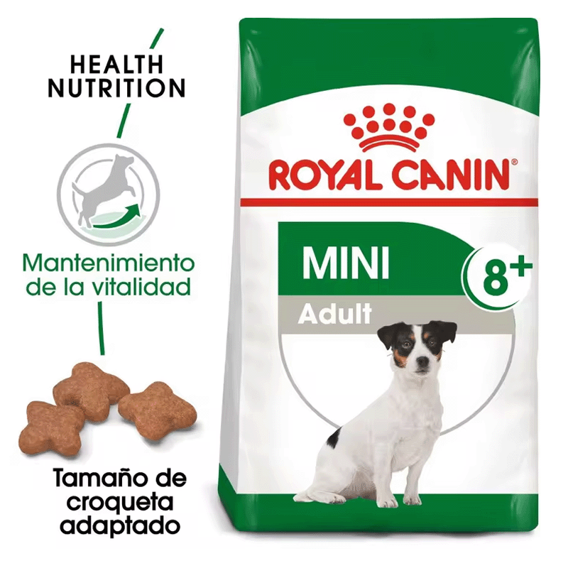 ROYAL CANIN® Mini Adult 8+ es un alimento diseñado para perros pequeños de 8 años en adelante, con un peso de hasta 10 kg. Esta fórmula ha sido especialmente creada para satisfacer las necesidades de tu canino en esta etapa de su vida. Contiene nutrientes adaptados que mantienen su vitalidad a medida que envejecen. Sabemos que algunos perros pequeños pueden ser selectivos con su comida, pero no te preocupes, Mini Adult 8+ de ROYAL CANIN® viene en sabores que seguramente disfrutarán. Además, este alimento contribuye a mantener un peso saludable, ya que los perros pequeños a menudo tienen necesidades de energía más elevadas, y esta fórmula equilibra esto de manera adecuada.