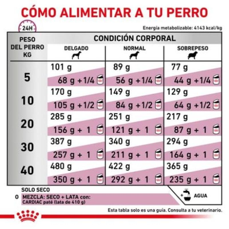 Este alimento debe administrarse únicamente bajo recomendación del veterinario. Se aconseja realizar la transición al nuevo pienso de forma gradual durante 5–7 días, mezclándolo con el alimento anterior e incrementando poco a poco la proporción de Royal Canin Veterinary Cardiac.