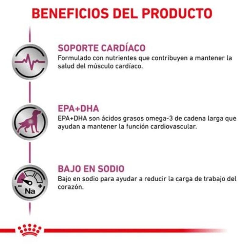 Royal Canin Veterinary Cardiac es un pienso dietético para perros adultos de cualquier raza con insuficiencia cardíaca crónica. Su fórmula baja en sodio y enriquecida con EPA, DHA y ácidos grasos omega-3 ayuda a mantener la función cardíaca y el bienestar general del perro, sin incluir medicamentos en su composición.
