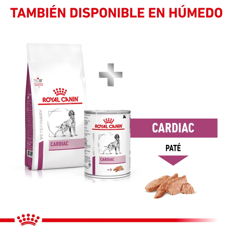 Royal Canin Veterinary Cardiac es un alimento dietético completo formulado para apoyar la función cardíaca en perros adultos con insuficiencia cardíaca crónica. Gracias a su bajo contenido en sodio y a su perfil nutricional específico, contribuye a reducir la carga de trabajo del corazón y a favorecer la calidad de vida del perro.