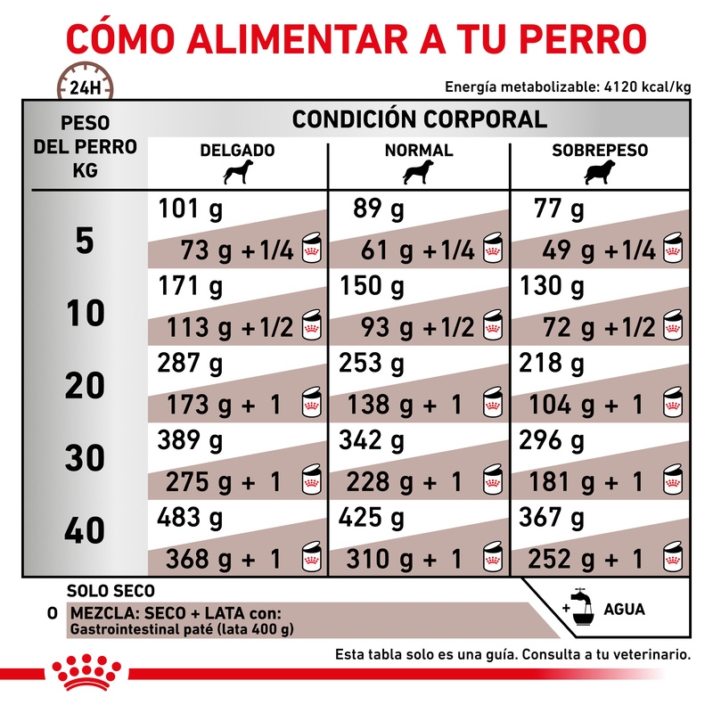 Las cantidades indicadas en la siguiente tabla son orientativas y deben ajustarse en función de la condición corporal, nivel de actividad y recomendación del veterinario. En perros con problemas digestivos, es aconsejable repartir la ración diaria en varias tomas pequeñas a lo largo del día.