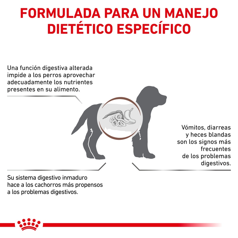 Pienso veterinario gastrointestinal para cachorros y madres lactantes, formulado para trastornos digestivos agudos, con alta digestibilidad, electrolitos y energía concentrada que apoyan la absorción de nutrientes y la recuperación intestinal.
