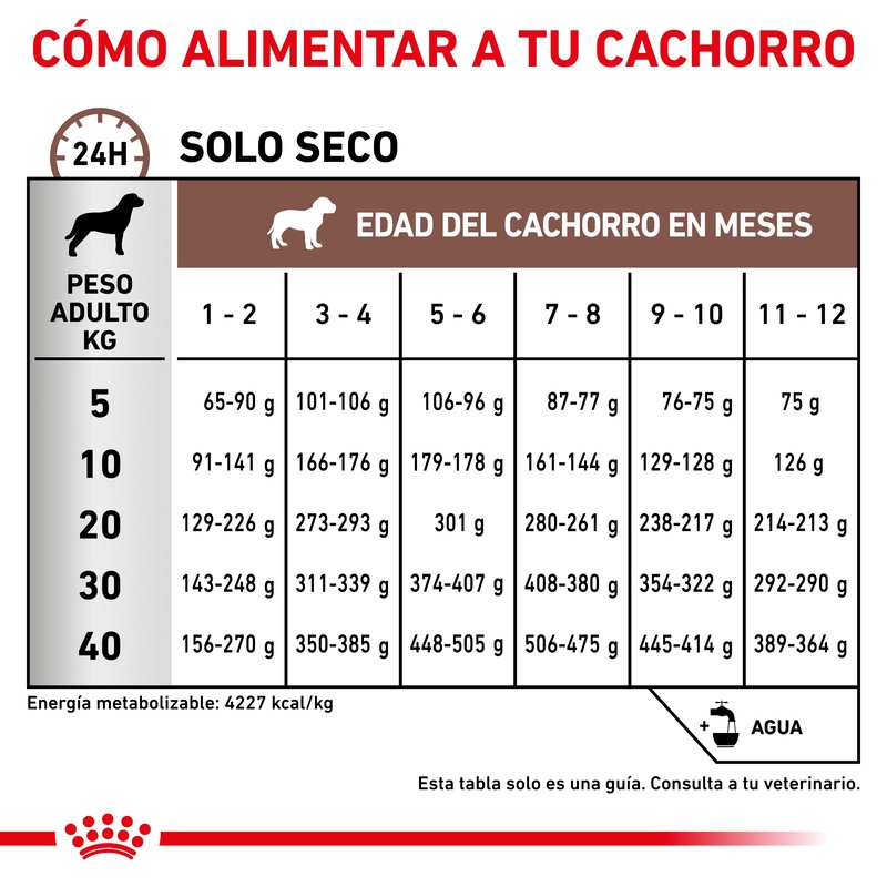 Este alimento debe utilizarse bajo recomendación de un veterinario, especialmente en casos de trastornos digestivos o mala absorción de nutrientes. La transición al nuevo pienso debe realizarse de forma gradual durante varios días. Ajusta la ración diaria según el peso adulto previsto, la edad del cachorro, su estado corporal y el consejo profesional. Mantén siempre agua fresca y limpia a libre disposición.