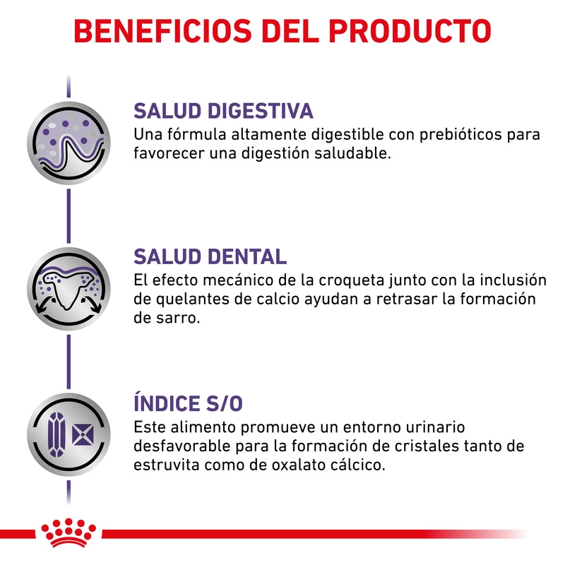 Las croquetas están diseñadas con una textura específica de efecto cepillado que ayuda a reducir la placa durante la masticación. Además, la fórmula incorpora quelantes de calcio que ayudan a limitar la formación de sarro, favoreciendo unas encías y dientes más sanos en perros de razas pequeñas, especialmente propensos a problemas orales.