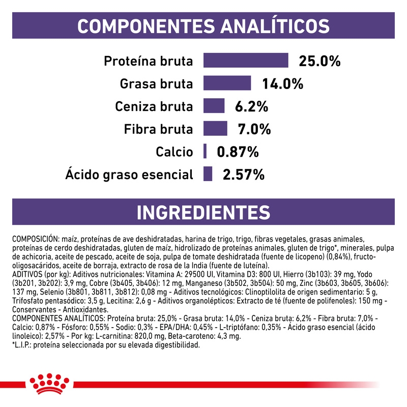 COMPONENTES ANALÍTICOS: Proteína bruta: 25,5% - Grasa bruta: 14,0% - Ceniza bruta: 6,2% - Fibra bruta: 7,0% - Calcio: 0,87% - Fósforo: 0,55% - Sodio: 0,3% - EPA/DHA: 0,45% - L-triptófano: 0,35% - L-carnitina: 820,0 mg/kg - Beta-caroteno: 4,3 mg/kg. *L.I.P.: proteína seleccionada por su elevada digestibilidad.