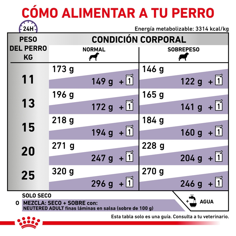 Se recomienda ofrecer Royal Canin Veterinary Neutered Adult M siguiendo las raciones diarias orientativas indicadas por el fabricante y ajustándolas según el peso, nivel de actividad y condición corporal de tu perro. Para conseguir una mejor tolerancia, es aconsejable realizar un cambio de dieta gradual durante varios días. Consulta siempre con tu veterinario antes de introducir o modificar una dieta veterinaria, especialmente en perros con sobrepeso u otros problemas de salud.