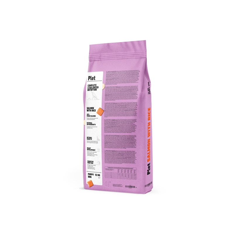 Pienso para cachorros sabor salmón con arroz. PLET ofrece un alimento completo y equilibrado. Su primer ingrediente, 20% de salmón fresco que aporta un gran valor nutricional en la primera etapa de vida del cachorro.