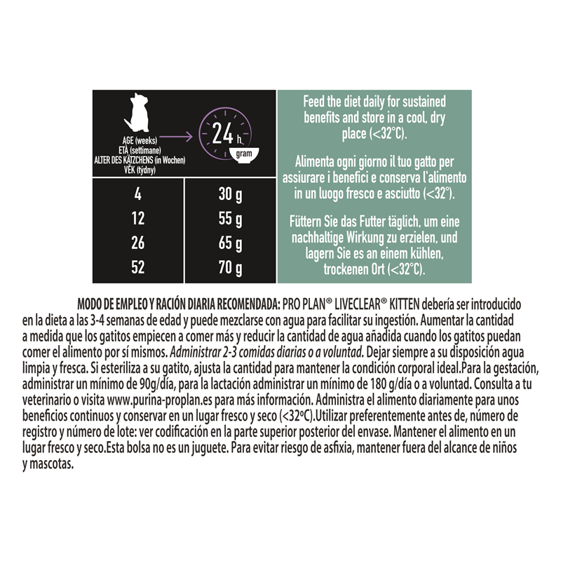 El pienso Pro Plan LiveClear Kitten con Pavo está diseñado especialmente para gatitos en crecimiento, ayudando a fortalecer su sistema inmunitario y a desarrollar unos músculos fuertes y una piel sana. Su fórmula exclusiva no solo nutre, sino que además reduce los alérgenos presentes en el pelo y la caspa del gato, lo que mejora la convivencia con las personas sensibles.