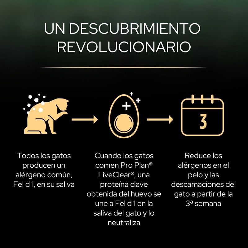 Gracias a su innovadora tecnología con una proteína específica del huevo, este alimento neutraliza los alérgenos Fel d1, ayudando a disminuir la exposición de los tutores a las alergias felinas. Su efecto se mantiene con el consumo diario, con una reducción media del 47% a partir de las 3 semanas de administración continua.
