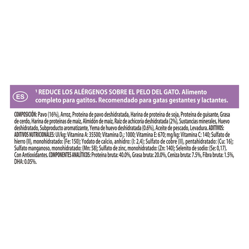 Pienso completo con pavo para gatitos hasta 1 año, formulado para reducir los alérgenos felinos, favorecer un crecimiento saludable y mejorar la convivencia con las personas sensibles.