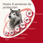 Pipetas antiparasitarias para perros grandes de 25 a 40 kg con imidacloprid y permetrina, que eliminan y repelen pulgas, garrapatas y mosquitos, ofreciendo hasta 4 semanas de protección con aplicación fácil y resistente al agua.