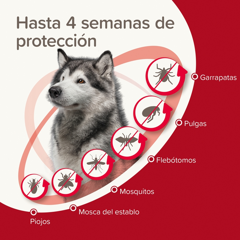 Tras su aplicación, los ingredientes activos se distribuyen por la capa grasa de la piel formando una barrera protectora. En aproximadamente 12 horas, este antiparasitario para perros comienza a actuar, ofreciendo una protección continua durante hasta 4 semanas. Además, estas pipetas para perros grandes ayudan a reducir el riesgo de transmisión de enfermedades como la leishmaniosis y la ehrlichiosis canina, especialmente en épocas de mayor presencia de parásitos.