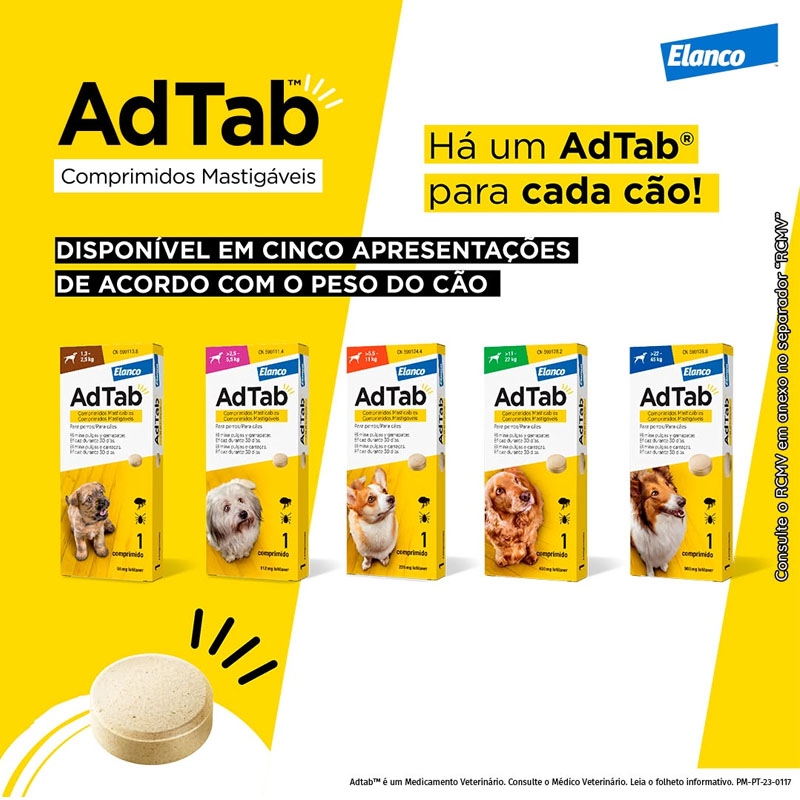Desenvolvido pela Elanco, o AdTab é fácil de administrar, pois é mastigável e pode ser misturado à comida ou administrado após a refeição. Com um agradável aroma de carne, seu cão aceitará este comprimido facilmente, garantindo cuidados eficazes e agradáveis.