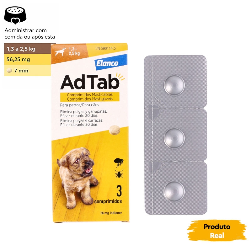 | ADTAB 56 mg COMPRIMIDOS MASTIGÁVEIS PARA CÃES (1,3–2,5 kg), Embalagem com 1 blister de 3 comprimidos | Cães de 1,3–2,5 kg | 56 mg Lotilaner |