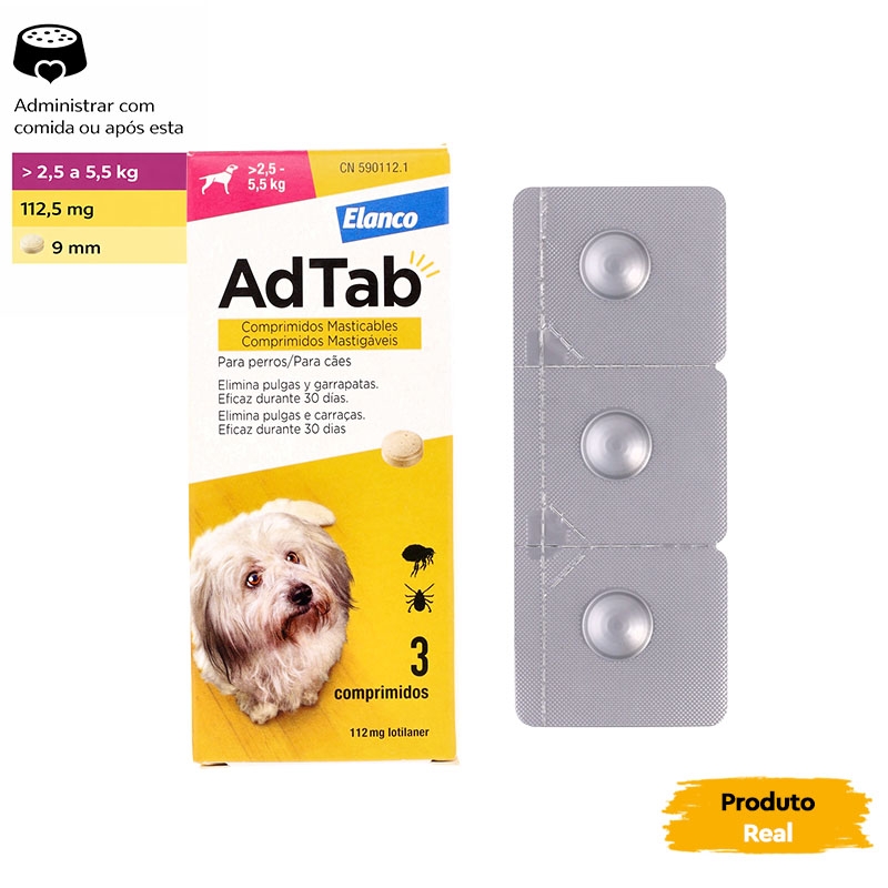 | ADTAB 112 mg COMPRIMIDOS MASTIGÁVEIS PARA CÃES (>2,5–5,5 kg), Embalagem com 1 blister de 3 comprimidos | Cães de >2,5–5,5 kg | 112 mg Lotilaner |