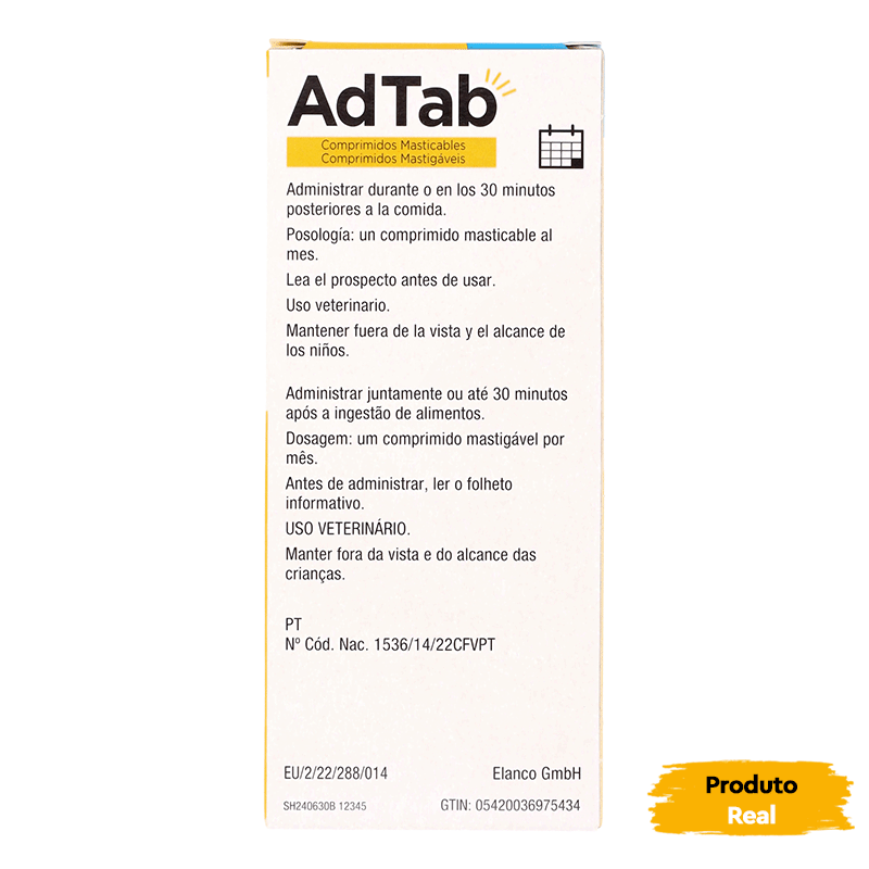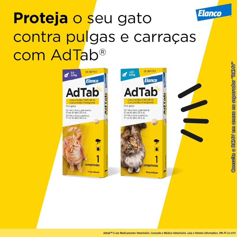 Os benefícios de uma única dose de Adtab persistem por até 30 dias, oferecendo um mês completo de tranquilidade para seu amigo peludo. Além disso, a administração é fácil e agradável, pois esses comprimidos têm um irresistível aroma de baunilha e uma textura que seu gato apreciará enquanto mastiga.