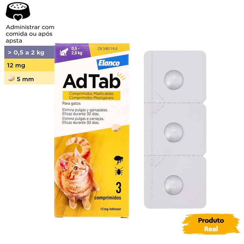 | ADTAB 12 mg COMPRIMIDOS MASTIGÁVEIS PARA GATOS (0,5–2,0 kg), Embalagem com 1 blister de 3 comprimidos | Gatos de 0,5–2,0 kg | 12 mg Lotilaner |