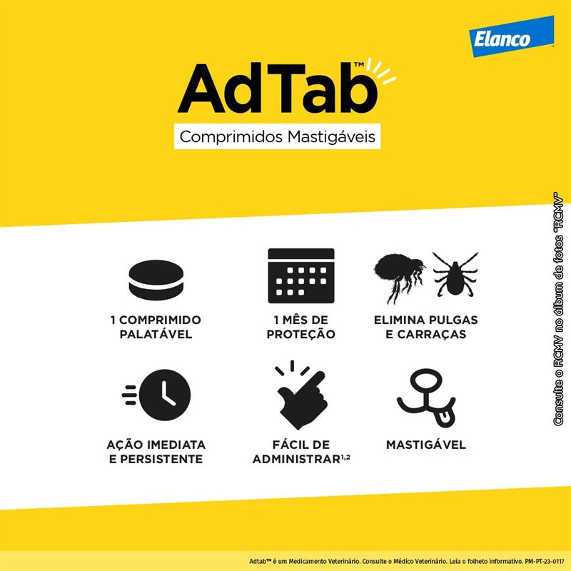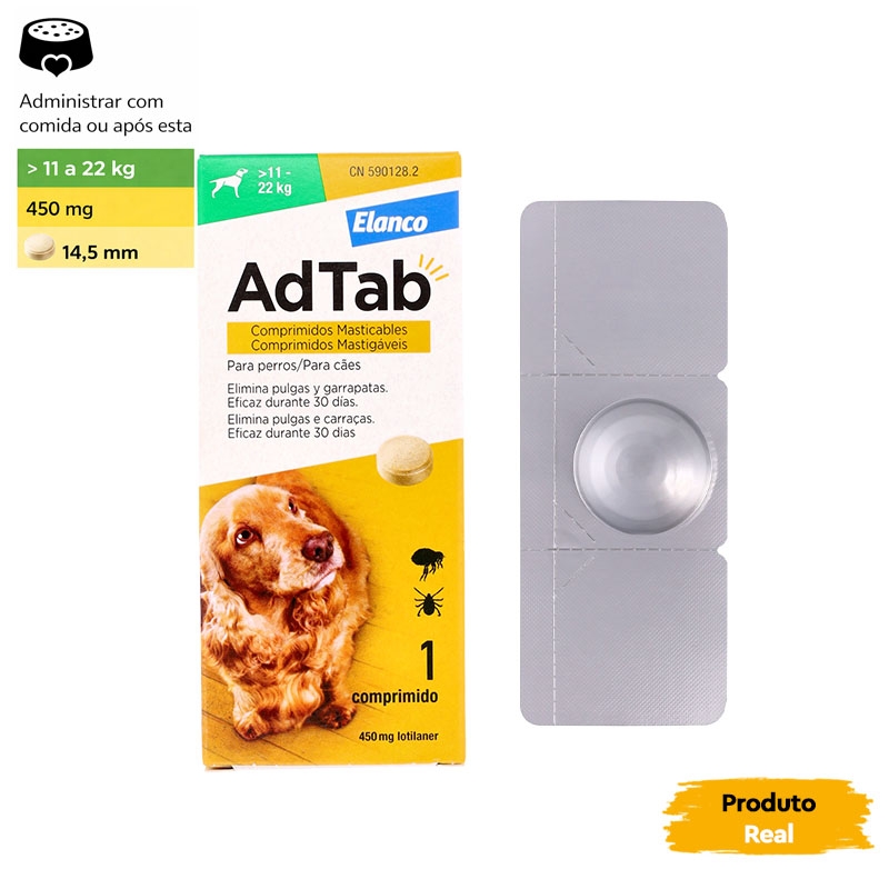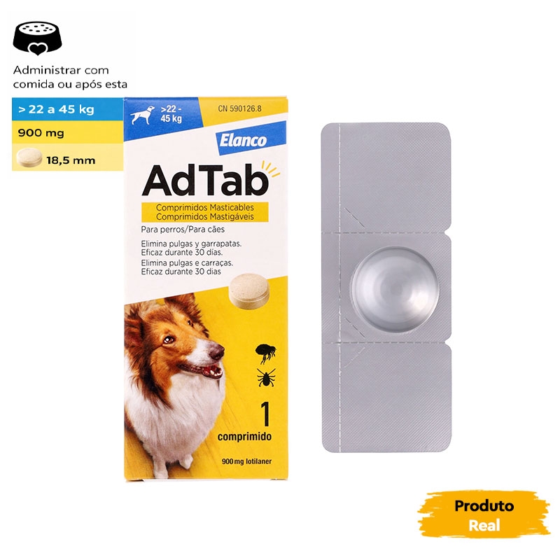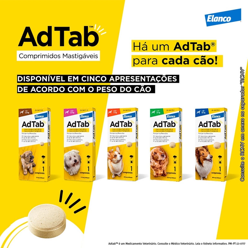 Desenvolvido pela Elanco, o AdTab é fácil de administrar, pois é mastigável e pode ser misturado à comida ou administrado após a alimentação. Com um agradável aroma de carne, seu cão aceitará este comprimido sem problemas, garantindo um cuidado eficaz e prazeroso.
