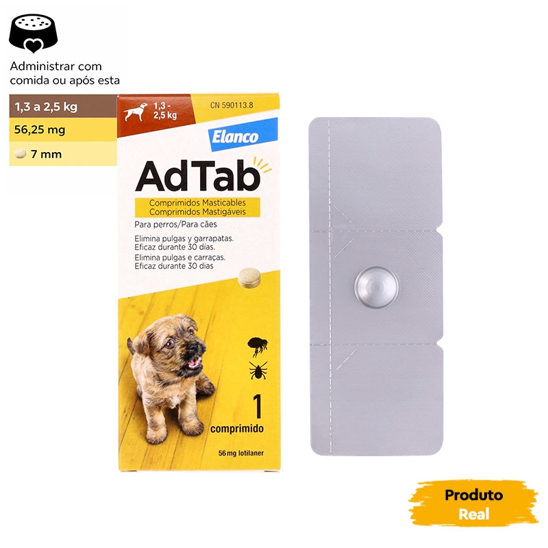 | ADTAB 56 mg COMPRIMIDOS MASTIGÁVEIS PARA CÃES (1,3–2,5 kg), Embalagem com 1 blister de 1 comprimido | Cães de 1,3–2,5 kg | 56 mg Lotilaner |