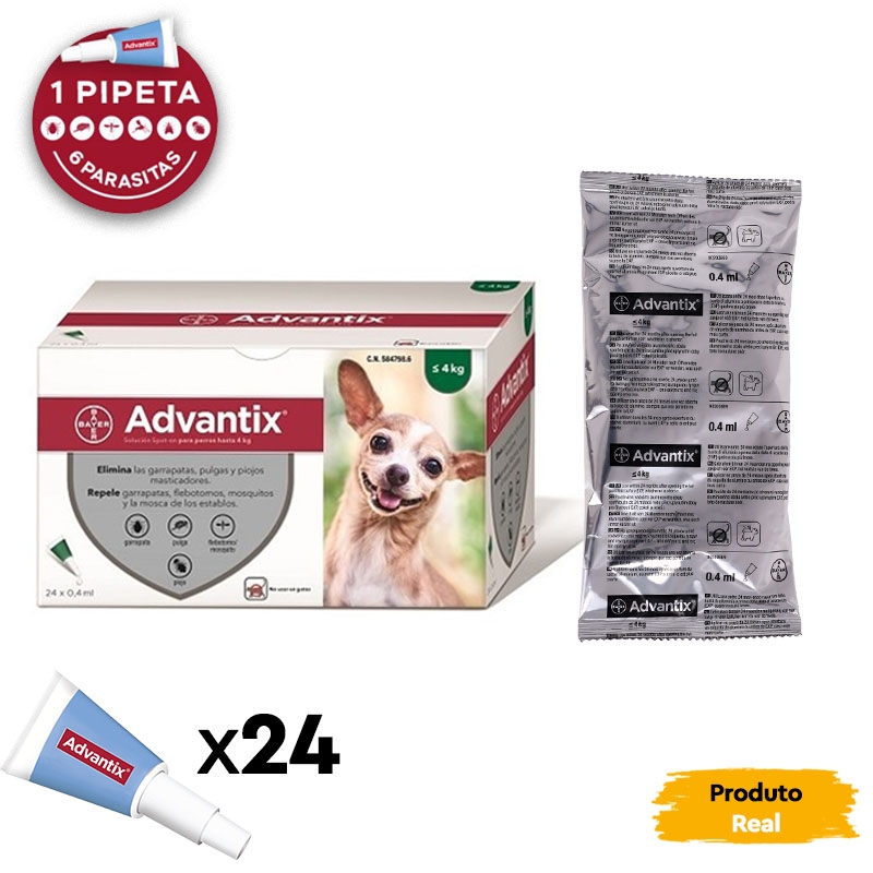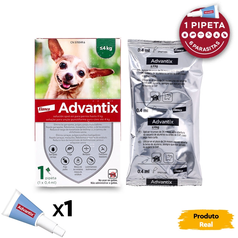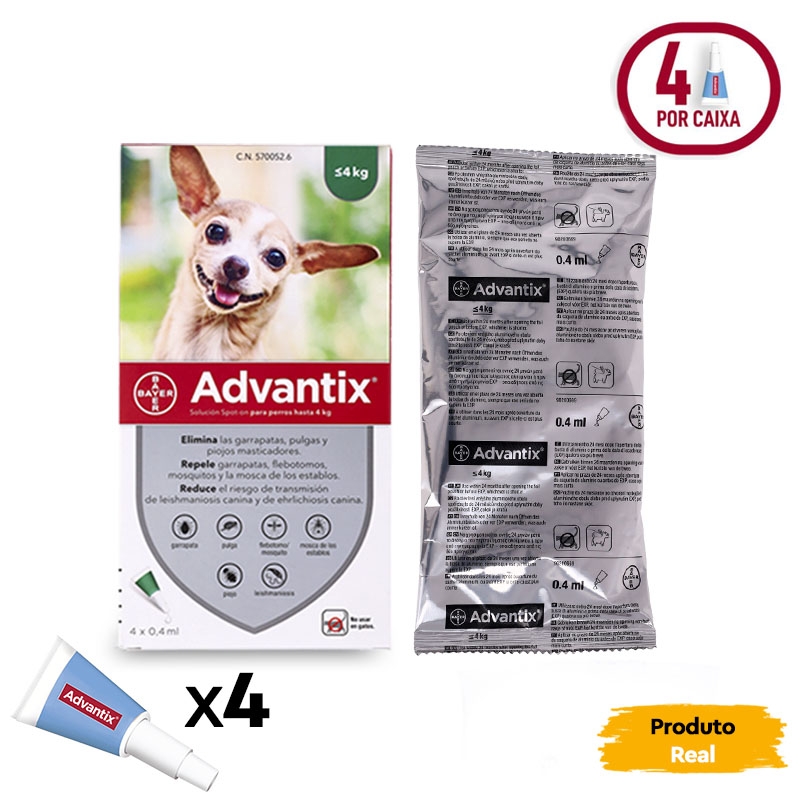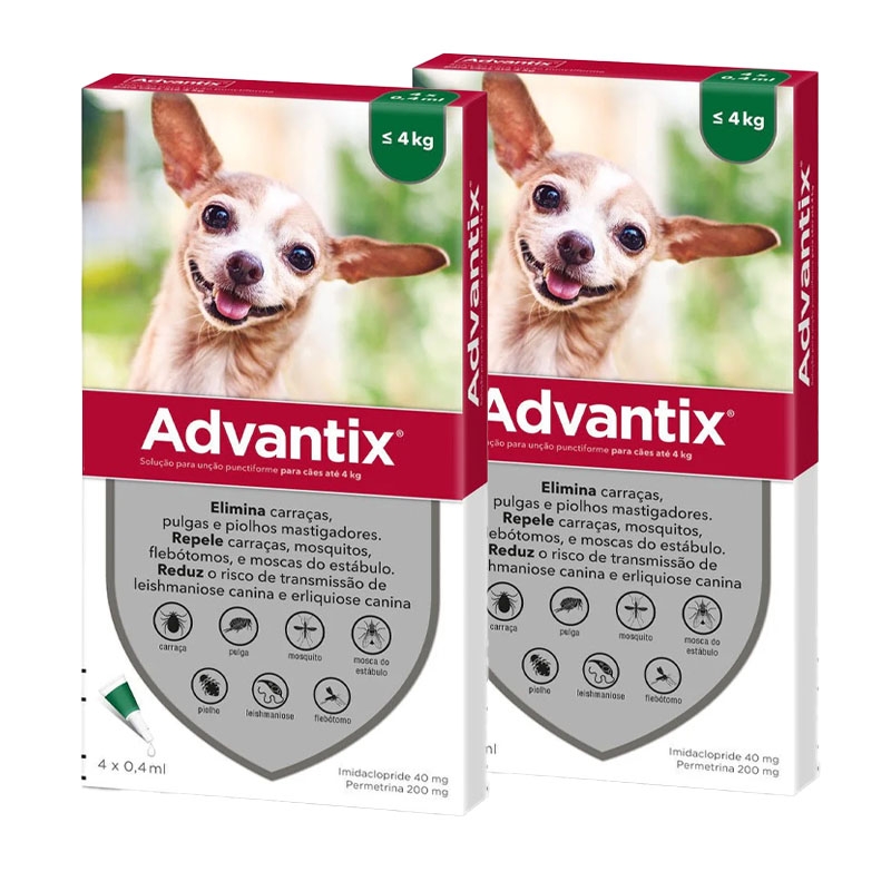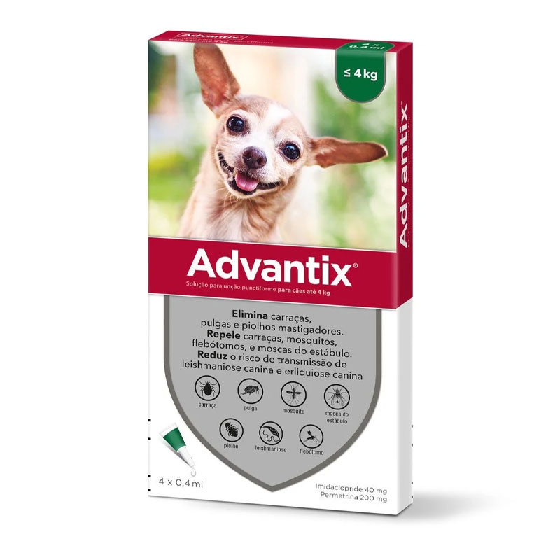 Advantix 0-4 kg é uma pipeta antiparasitária especialmente formulada para cães pequenos com peso entre 0 e 4 kg. Esta pipeta, desenvolvida pelos Laboratórios Bayer, foi projetada para prevenir e reduzir a incidência de carrapatos, pulgas, mosquitos e outros insetos por 4 semanas. Consulte o seu veterinário para confirmar se este tratamento é adequado para o seu cão.