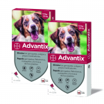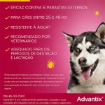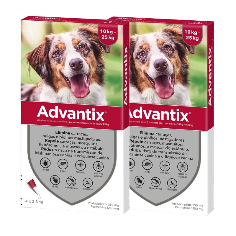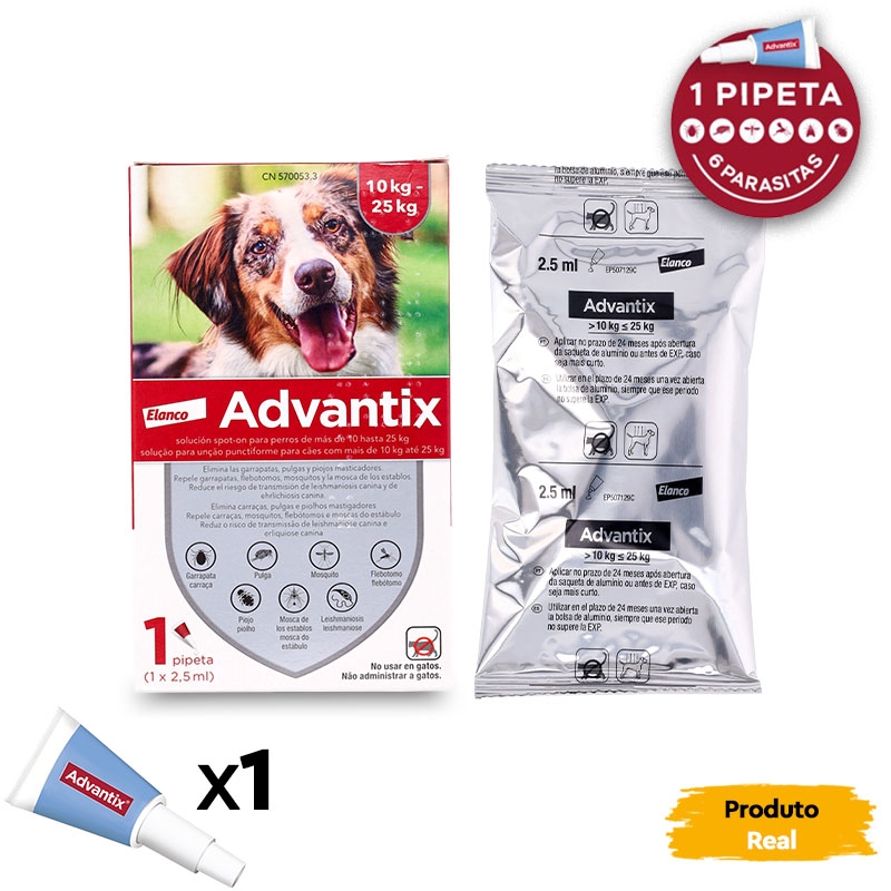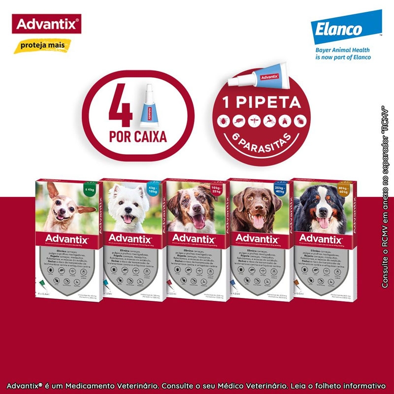 Também disponível em formato : Advantix 0-4 kg para cães mini, Advantix 4-10 kg para cães pequenos e Advantix 10-25 kg para cães de porte médio.