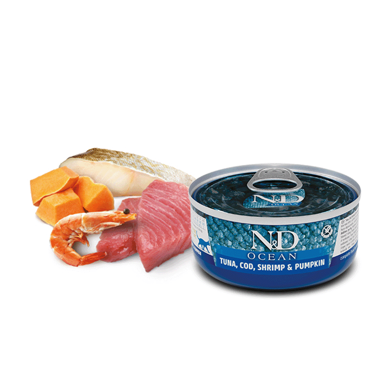 N&D Ocean Feline oferece alimento completo para gatos adultos com uma combinação premium de atum, bacalhau, camarão e abóbora.