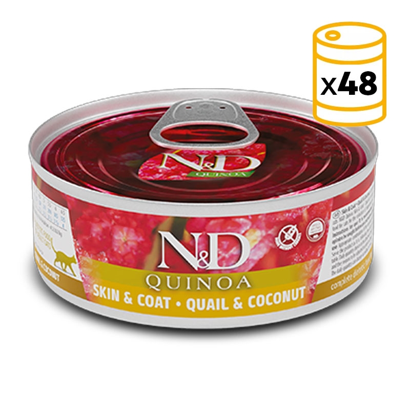 N&D Quinoa Skin & Coat oferece uma opção completa e equilibrada para o cuidado nutricional de gatos adultos, especialmente formulada para aqueles com pele sensível. Este alimento úmido dietético completo, conhecido como lata Skin & Coat Codorna, é projetado para ajudar na redução de intolerâncias a ingredientes e nutrientes, proporcionando uma alimentação saborosa e nutritiva para os felinos com necessidades dietéticas específicas.
