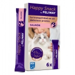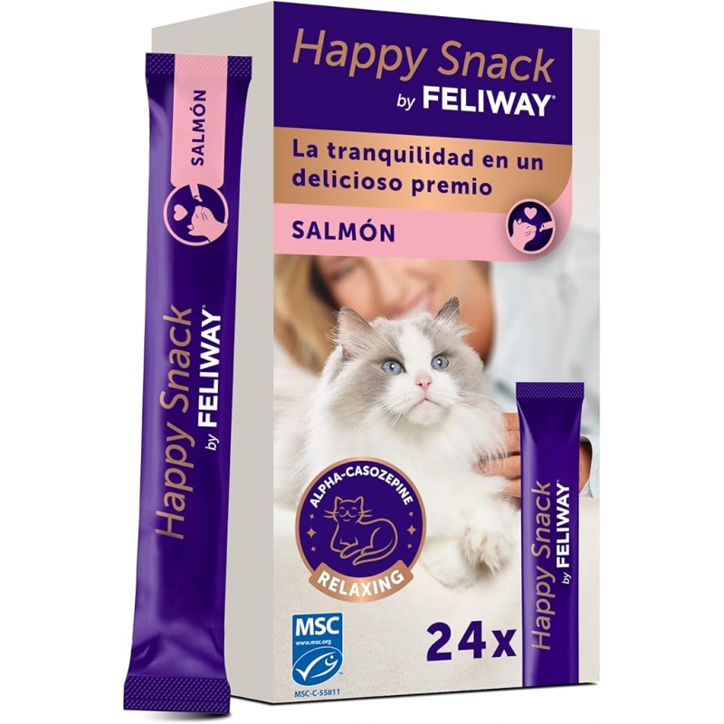 Happy Snack by Feliway é um delicioso snack cremoso com sabor a salmão desenvolvido para ajudar os gatos a sentirem-se mais tranquilos no dia a dia. A sua fórmula contém alfa-casozepina, uma proteína natural do leite conhecida pelas suas propriedades calmantes.