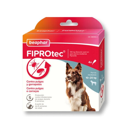 Pipetas antiparasitárias para cães médios de 10 a 20 kg com fipronil, que eliminam pulgas e carraças por contacto, oferecendo até 5 semanas de proteção contra pulgas e 4 semanas contra carraças com aplicação fácil e eficaz.