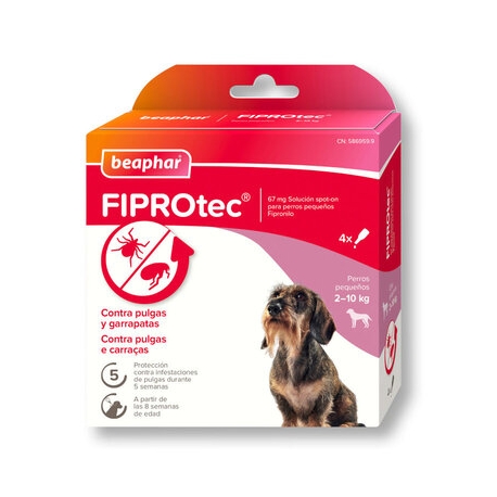 Pipetas antiparasitárias para cães pequenos de 2 a 10 kg com fipronil, que eliminam pulgas e carraças por contacto, proporcionando até 5 semanas de proteção contra pulgas e 4 semanas contra carraças com aplicação fácil.