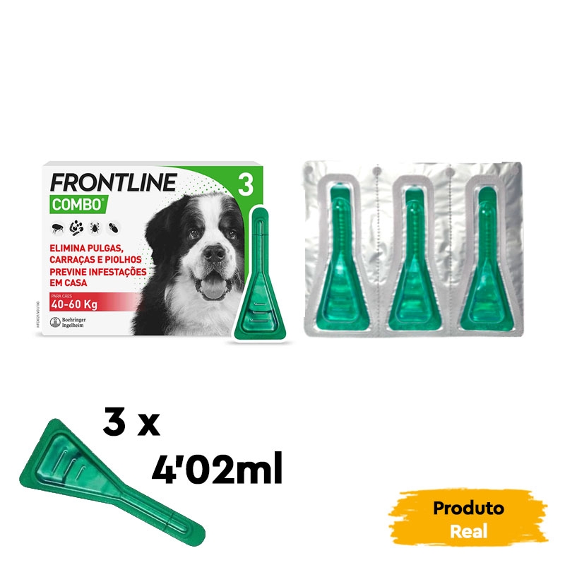 Frontline Combo +40 Kg age rapidamente e por contato, eliminando pulgas, carrapatos e piolhos aderidos à pele do cão. A molécula inseticida fipronil afeta o sistema nervoso dos insetos, provocando uma morte por hiperexcitação nervosa. Além disso, o Frontline Combo não apenas elimina os parasitas presentes em seu cão, mas também nos espaços que ele frequenta, como sua cama ou casinha.