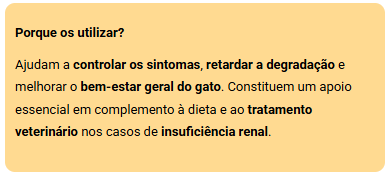 Ajudam a controlar os sintomas, retardar a degradação e melhorar o bem-estar geral do gato. Constituem um apoio essencial em complemento à dieta e ao tratamento veterinário nos casos de insuficiência renal.