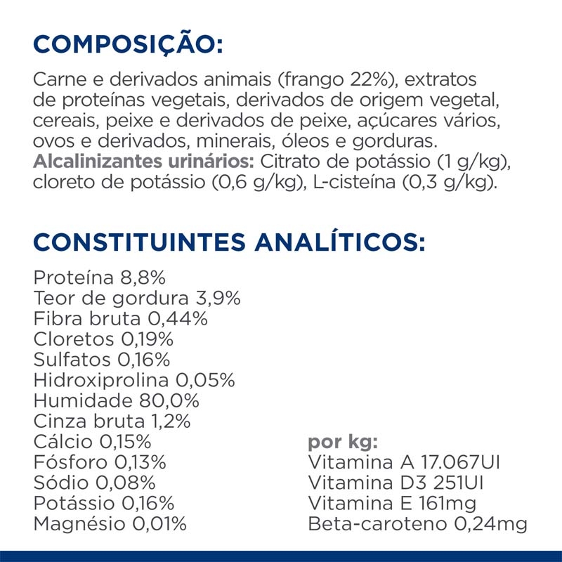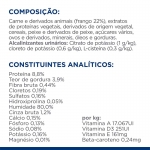 COMPOSIÇÃO: Carnes e subprodutos de animais (frango 22%), extratos de proteínas vegetais, subprodutos de origem vegetal, cereais, peixes e subprodutos de peixe, açúcares, ovos e produtos de ovos, substâncias minerais, óleos e gorduras. Substâncias alcalinizantes da urina: Citrato de potássio (1 g/kg), Cloreto de potássio (0,6 g/kg), L-cisteína (0,3 g/kg).
