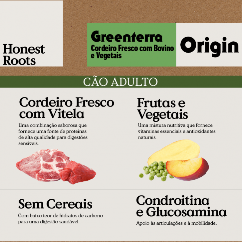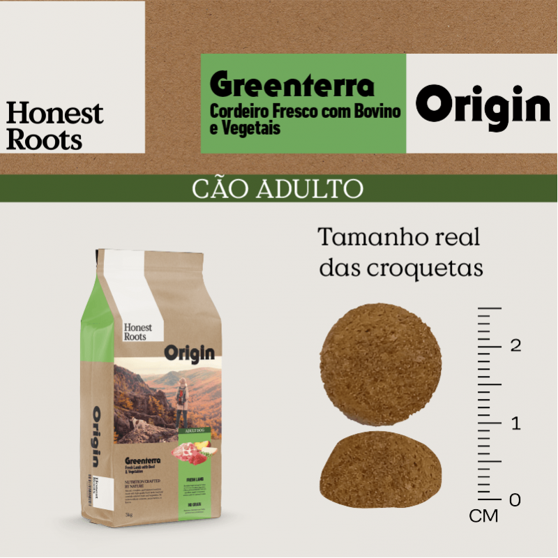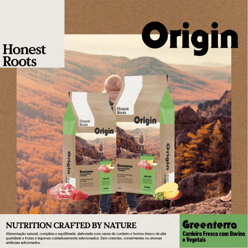 Feita com ingredientes selecionados e sem aditivos artificiais, Honest Roots Origin Greenterra é a ração natural para cães ideal para quem procura uma alimentação natural equilibrada, nutritiva e saborosa.