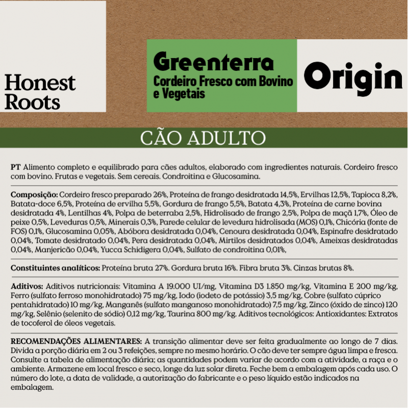 Honest Roots Origin Greenterra é uma ração natural para cães adultos formulada com cordeiro fresco e carne de vaca como principais fontes de proteína animal. Esta receita sem cereais é inspirada na alimentação natural do cão, oferecendo uma nutrição completa, equilibrada e de fácil digestão, ideal para cães com sensibilidade digestiva.