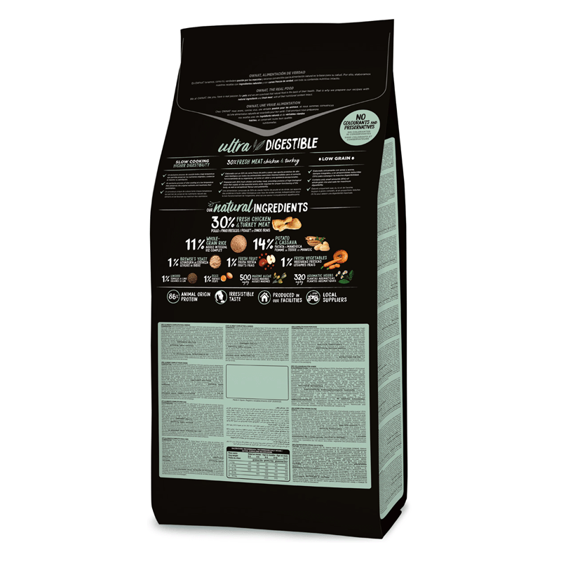 Frango fresco* (mínimo de 15% antes do cozimento), peru fresco* (mínimo de 15% antes do cozimento), frango desidratado (14%), gordura de frango (preservada com antioxidantes naturais), ervilhas inteiras* (8%), batata desidratada* (8%), arroz integral* (7%), raízes de mandioca* (4%), porco desidratado (4%), cevada integral* (3%), salmão desidratado (2,5%), levedura de cerveja* (2%), proteína hidrolisada de frango (2%), ovo desidratado* (2%), vegetais e frutas frescas antes do cozimento (maçã* 1%, cenoura* 0,5%, abóbora* 0,5%), semente de linho* (1%), óleo de salmão (preservado com antioxidantes naturais), sal gema*, raízes de chicória (FOS)*, extrato de leveduras (MOS), algas marinhas desidratadas* (500 mg/kg), glucosamina (500 mg/kg), yucca schidigera, condroitina sulfato (100 mg/kg), mirtilos* (100 mg/kg), chá verde* (80 mg/kg), equinácea* (80 mg/kg), camomila* (80 mg/kg), funcho* (80 mg/kg). *INGREDIENTES NATURAIS