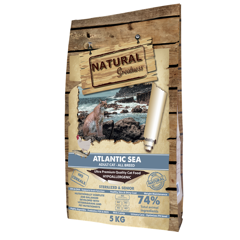 Natural Greatness Gatos apresenta a sua receita Atlantic Sea, uma ração hipoalergénica elaborada com elevadas percentagens de salmão fresco. Esta ração natural foi especialmente concebida para Natural Greatness Gatos Esterilizados e Natural Greatness Gatos Sénior, ajudando a manter o peso ideal e fornecendo todos os nutrientes necessários para uma vida saudável. Graças à sua fórmula sem cereais, rica em ácidos gordos ómega 3 e 6, favorece a digestão, cuida da pele e mantém o pelo brilhante.