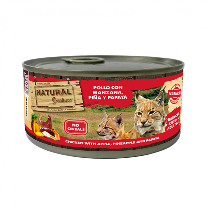 A Natural Greatness Gatos com frango, maçã, ananás e papaia é uma comida húmida natural especialmente formulada para oferecer ao teu felino um alimento húmido completo, nutritivo e equilibrado. Elaborada com carne fresca de frango de qualidade humana e frutas selecionadas, esta receita assegura um aporte ideal de proteínas, vitaminas e antioxidantes, garantindo uma dieta saudável e cheia de sabor.