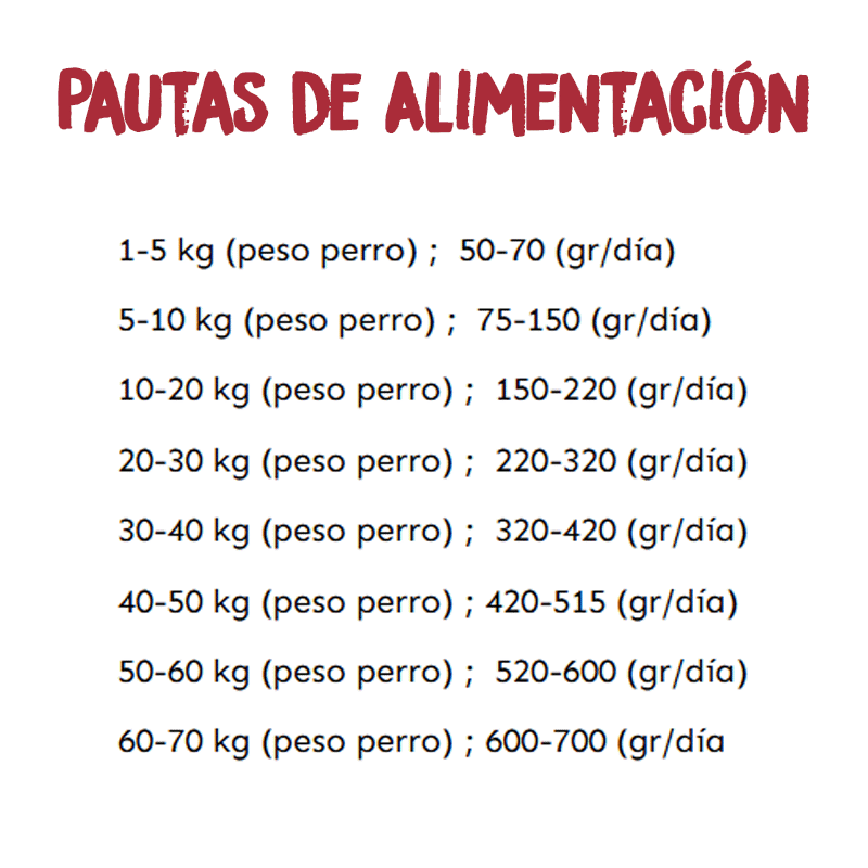Componentes analíticos: Proteína: 41%, teor de gordura: 20%, fibra bruta: 2,5%, matéria inorgânica: 8,5%, humidade: 8%, Omega 6: 3,8%, Omega 3: 0,4%, cálcio: 1,5%, fósforo: 1%.