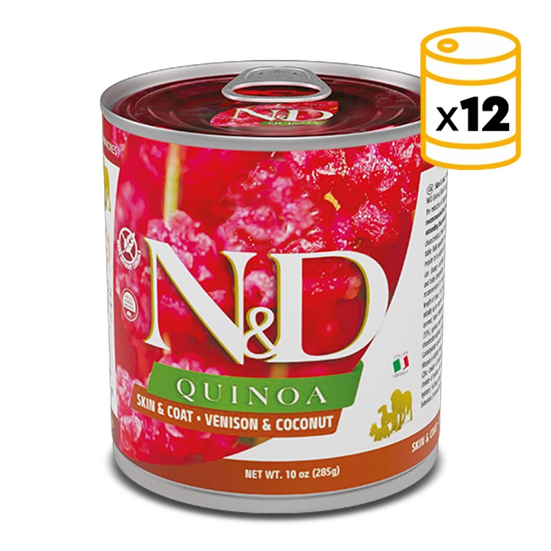 Farmina ND Dog Quinoa Skin Coat Veado: comida húmida para cães com pele sensível e alto teor proteico.