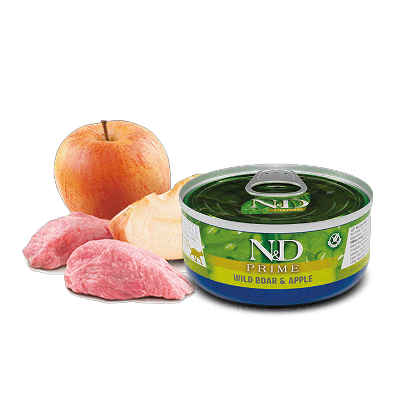 N&D Prime Feline oferece alimento completo para gatos adultos, com uma fórmula premium de javali e maçã.