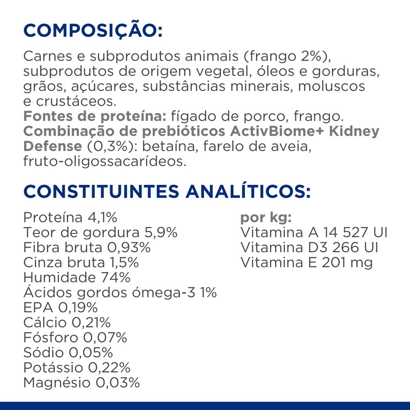 COMPOSIÇÃO : Carnes e subprodutos animais (frango 5%), cereais, óleos e gorduras, subprodutos de origem vegetal, açúcares, sementes, verduras (1,2%), substâncias minerais, ovos e ovoprodutos. Fontes de proteína: frango, fígado de porco, ovos desidratados. Combinação de prebióticos ActivBiome+ Kidney Defense (0,29%): betaína, farelo de aveia, frutooligossacarídeos.