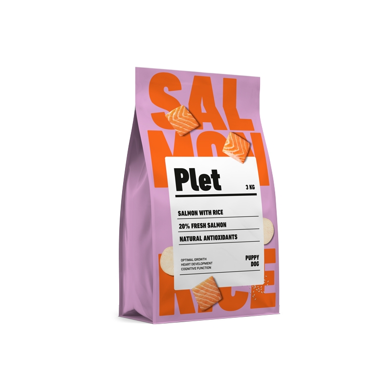 Comida para cães sabor salmão com arroz. A PLET oferece uma alimentação completa e equilibrada. Seu primeiro ingrediente é 20% de salmão fresco que fornece grande valor nutricional durante a primeira fase de vida do cãozinho.