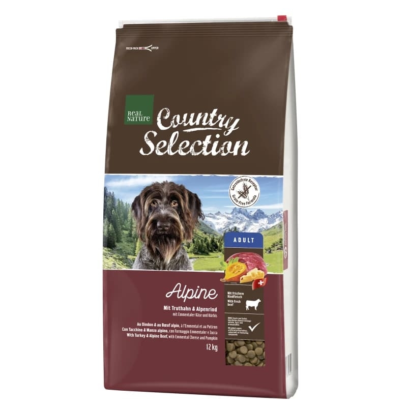 Real Nature Country Selection Alpine Adult oferece uma receita grain free com alta percentagem de carne fresca, fornecendo proteína de qualidade e sabor natural. A combinação de peru, vaca alpina e abóbora é enriquecida com vitaminas e minerais para manter a vitalidade e uma condição corporal equilibrada todos os dias.