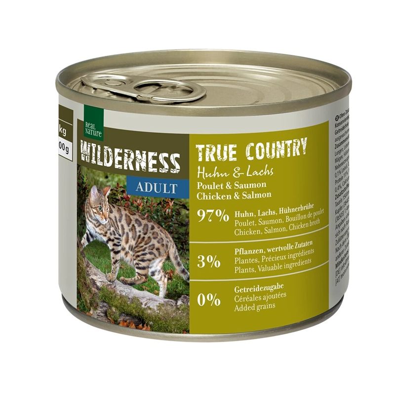 Real Nature Wilderness usa apenas ingredientes naturais, como frango e salmão, juntamente com ingredientes vegetais como mirtilos, para complementar a nutrição do seu gato. Esses ingredientes fornecem vitaminas, minerais e antioxidantes essenciais para apoiar a saúde digestiva e a vitalidade geral do seu pet.