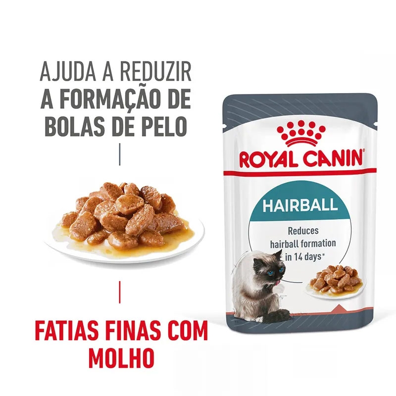 O Hairball Care em molho da ROYAL CANIN® foi desenvolvido para abordar o problema das bolas de pelo em gatos. Os gatos, ao se acicalharem, podem ingerir pelo que posteriormente se acumula em seu sistema digestivo, causando bolas de pelo incômodas. Esta fórmula ajuda naturalmente a estimular o trânsito intestinal, permitindo a eliminação do excesso de pelo ingerido e evitando seu acúmulo no estômago. Além disso, contribui para a manutenção do peso ideal graças ao seu baixo teor de gordura (apenas 2,7%) e fornece energia por meio de ácidos graxos essenciais.