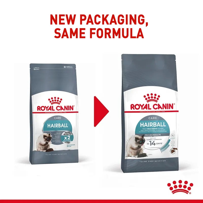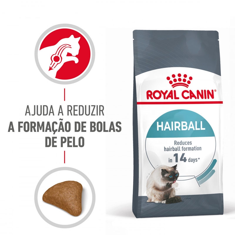 Os gatos passam muito tempo se lambendo, o que pode levar à ingestão de pelo. Isso pode causar a formação de bolas de pelo em seu sistema digestivo, que muitas vezes são regurgitadas ou expelidas nas fezes. Hairball Care da ROYAL CANIN® aborda esse problema ao incluir uma mistura especial de fibras, como o psílio, que estimula o trânsito intestinal de forma natural. Isso permite que o pelo ingerido seja eliminado nas fezes em vez de se acumular no estômago.