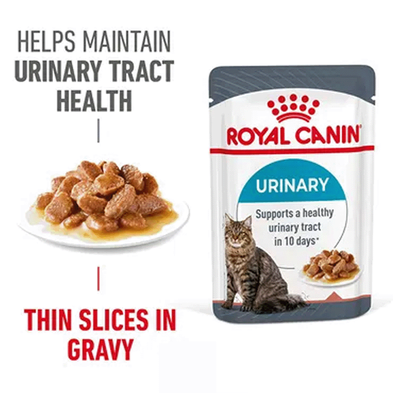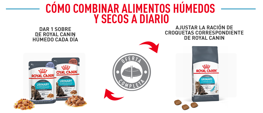 ROYAL CANIN® Urinary Care também está disponível em gelatina e em alimento seco. A combinação de alimentos úmidos e secos proporciona variedade e benefícios aos gatos. Enquanto as croquetes secas criam um efeito de escovação dental e são mais fáceis de armazenar, o teor de água do alimento úmido promove a hidratação e a saúde urinária.